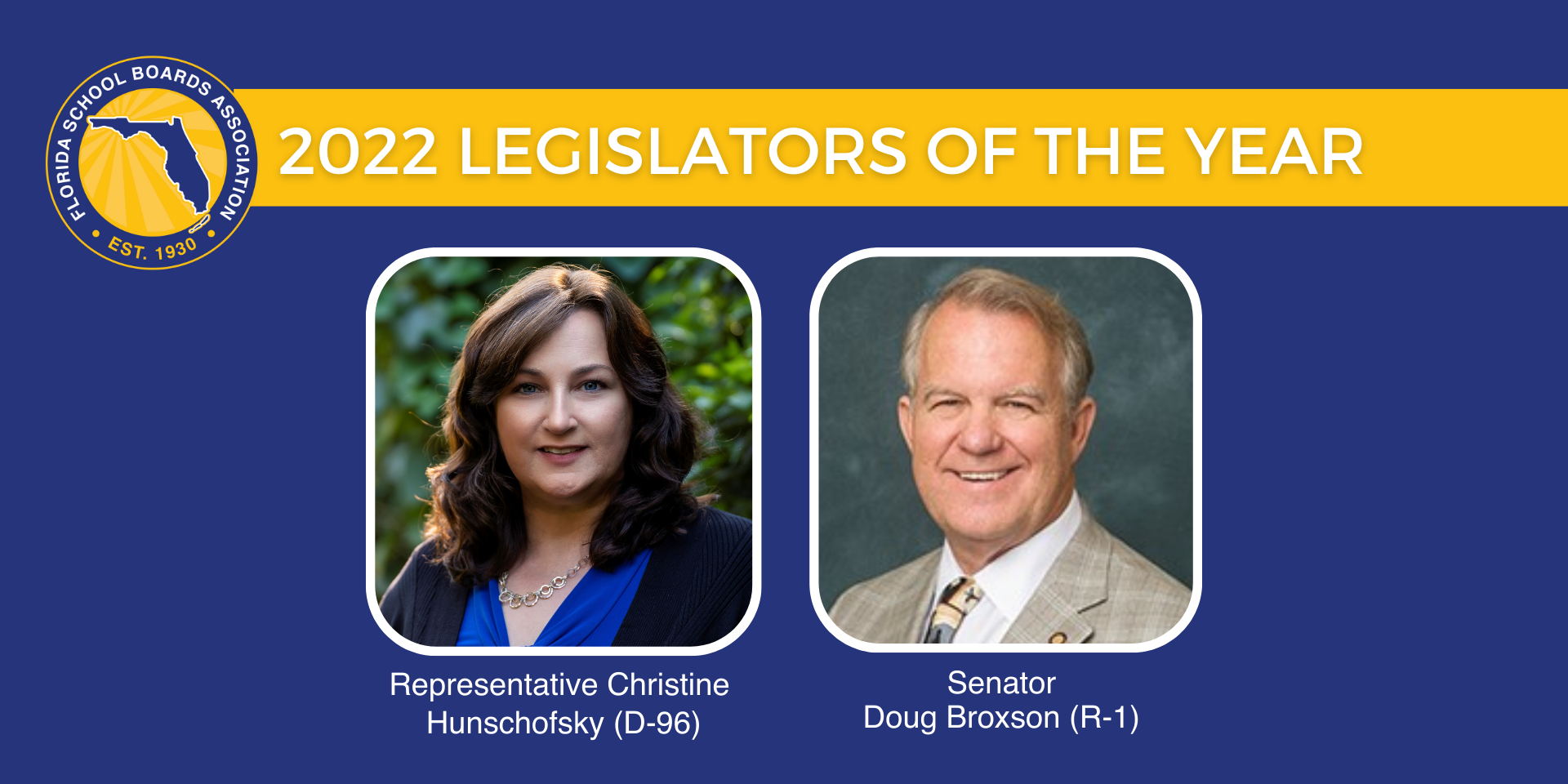 “We are proud to recognize Senator Broxson and Representative Hunschofsky for their steadfast efforts to ensure that every student in Florida receives a high-quality education. It is especially important to recognize their commitment to increased funding for public education to historic levels. This increased funding comes at a critical time as public schools work to accelerate student achievement following the education disruption caused by the pandemic.” said Kim Amontree, Charlotte County School Board Member and FSBA Legislative Committee Chair.